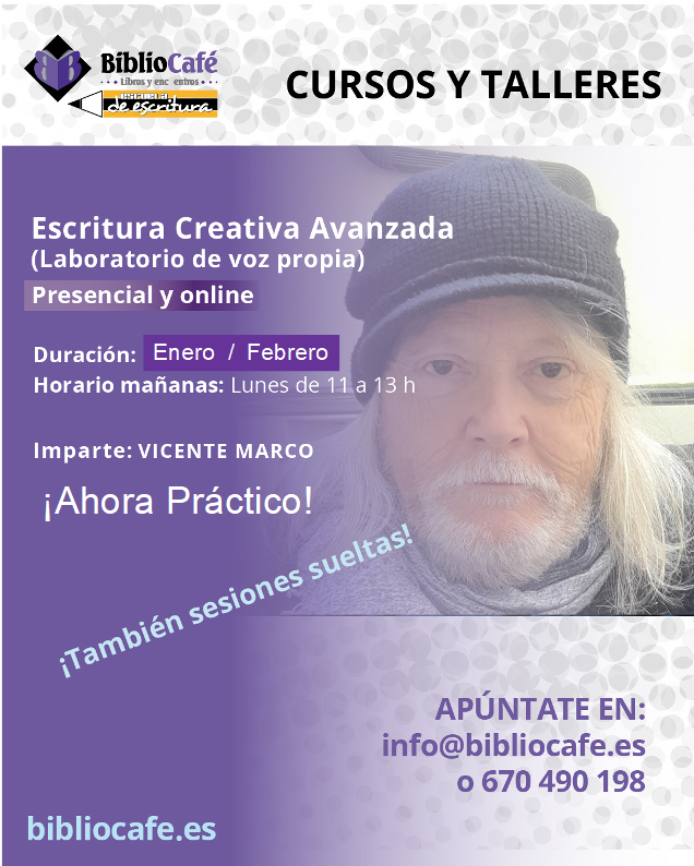 Etiquetas: curso escritura, curso escritura avanzada, curso escritura online, curso escritura presencial, curso online, escritura creativa, escritura práctica, laboratorio de voz propia, novela, relatos, revisa tus textos, taller escritura, taller presencial, teatro, vicente marco.